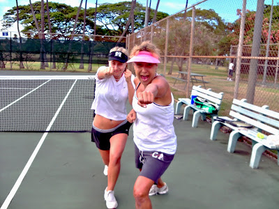 They show us Taikwondo demonstration. Their level are both black belt which is high rank then white and red belt. Shelby is a strong player because she play tennis everyday. They will come to the court tomorrow morning for rematch against me and Hiro(we won 6:4)